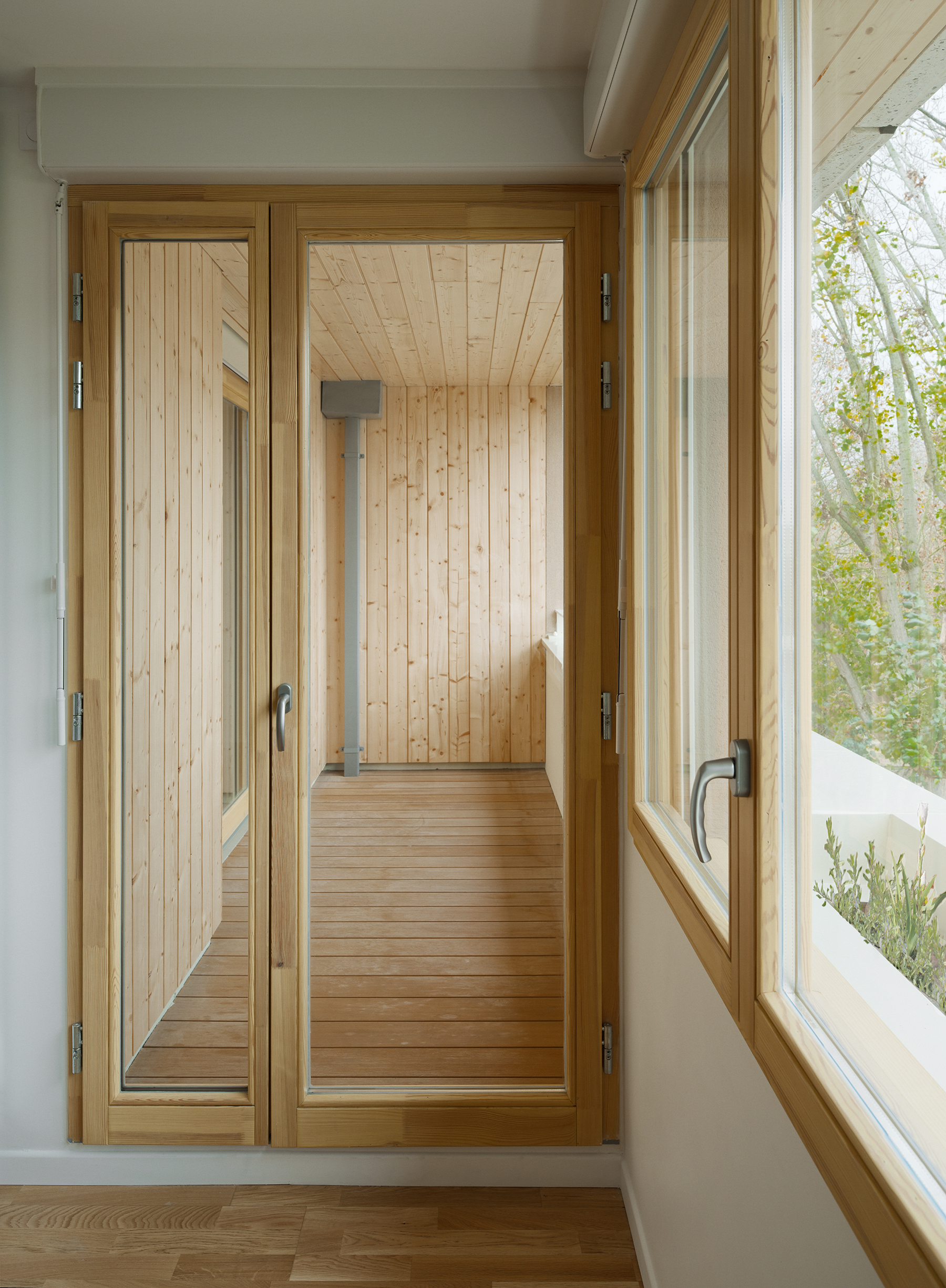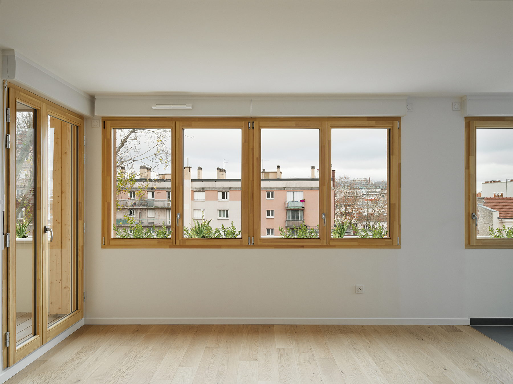 enduit lissé, allèges en béton préfabriqué, menuiseries extérieures en bois équipées de volets roulants en PVC, façade commerciale aluminium thermolaqué, fonds de loggia avec habillages bois, toitures jardinées et végétalisées, serrurerie en métal laqué, garde-corps ajourés, constitués d’un barreaudage vertical