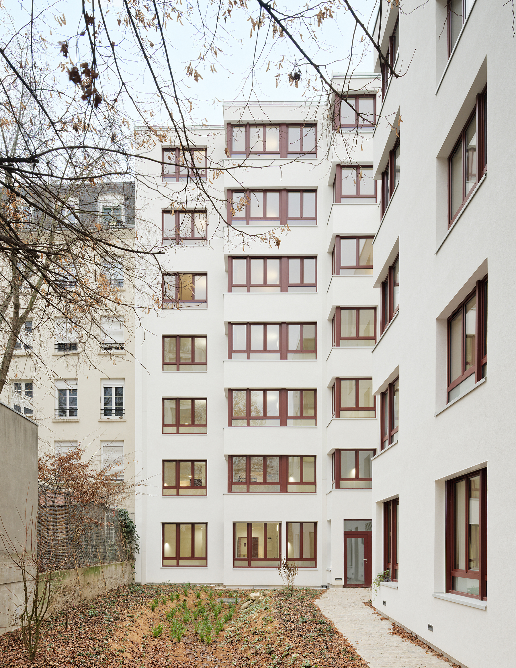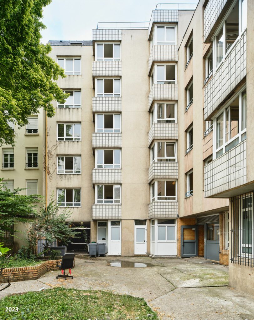 Sur rue, le projet optimise la capacité constructive en tirant parti des deux niveaux de comble et du porche existant accueillant les locaux communs. En fond de parcelle, le rez-de-chaussée est surélevé d’un niveau tout en préservant les jours existants en mitoyenneté. L’ensemble valorise ce parc résidentiel parisien sans augmenter son emprise bâtie.