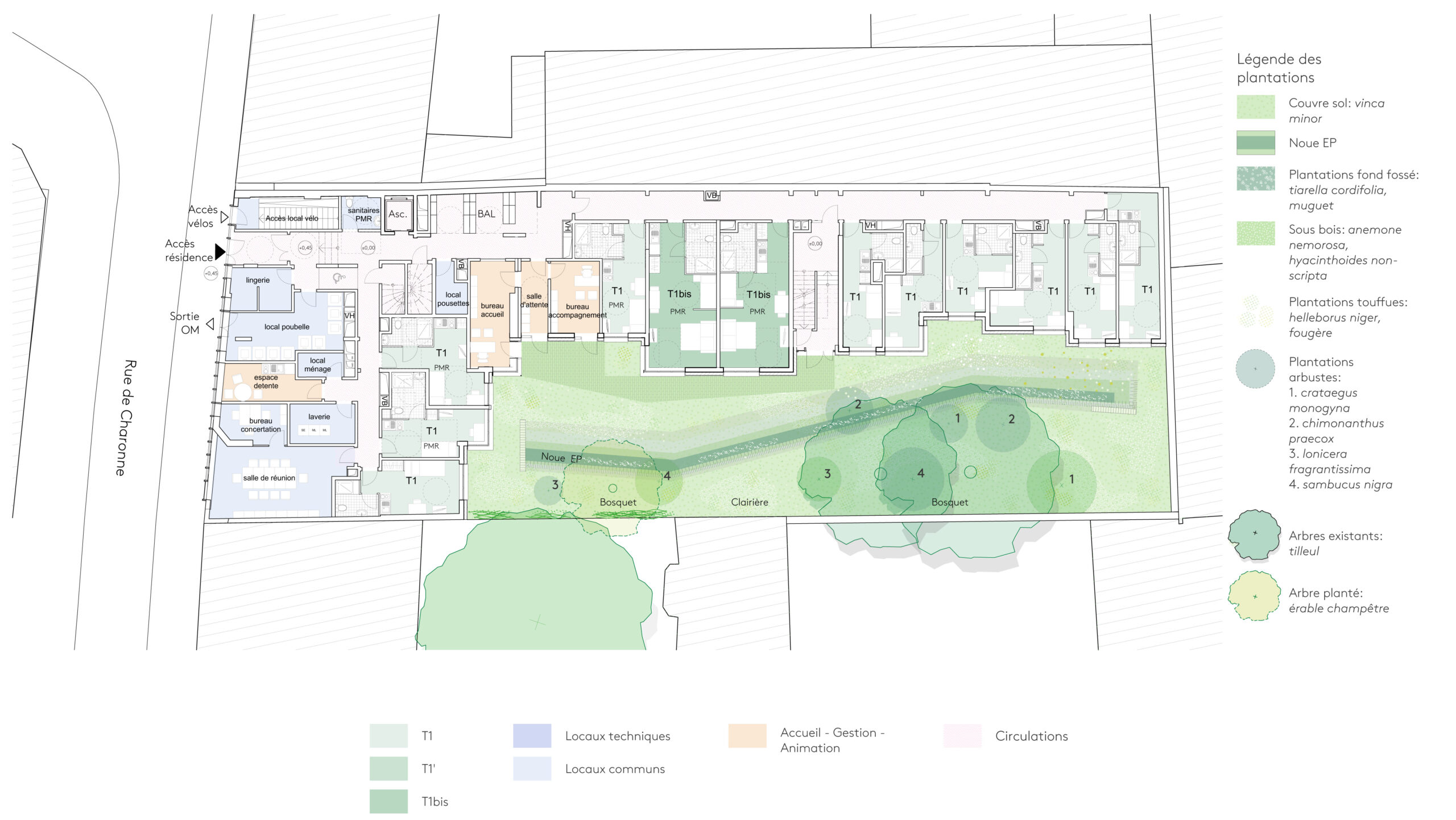 La cour minérale existante devient un jardin d’agrément et un îlot de fraîcheur agréable qui participe à la lutte contre le réchauffement climatique et au développement d’un nouvel écosystème.